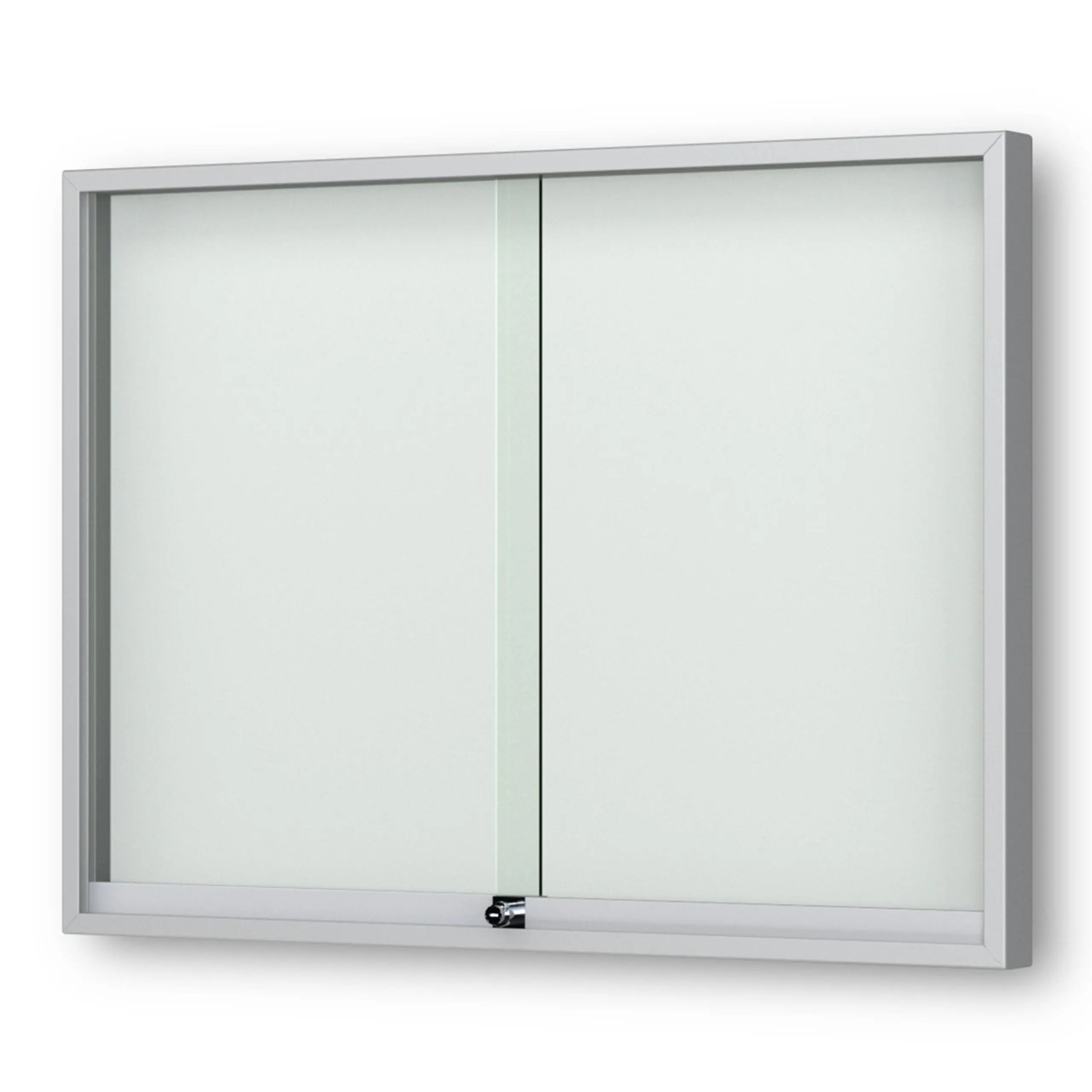 Schaukasten Fortis - eckig - mit Schiebetüren - 210 mm Gehäusetiefe, rollengelagerte Schiebetüren, höchster Brandschutz (A1) Größe - 8 × DIN A4 • 930 × 695 mm Öffnung - rollengelagerte SchiebetürenVerglasung - Einscheiben-Sicherheitsglas / ESGOberfläche - Eloxierung in matt-silber (E6/EV1)Beleuchtung - ohne BeleuchtungSchließung - Sicherheitsschlösser mit je 2 SchlüsselnRückwand - weiße, magnethaftende Rückwand inkl. 10 Magnete
